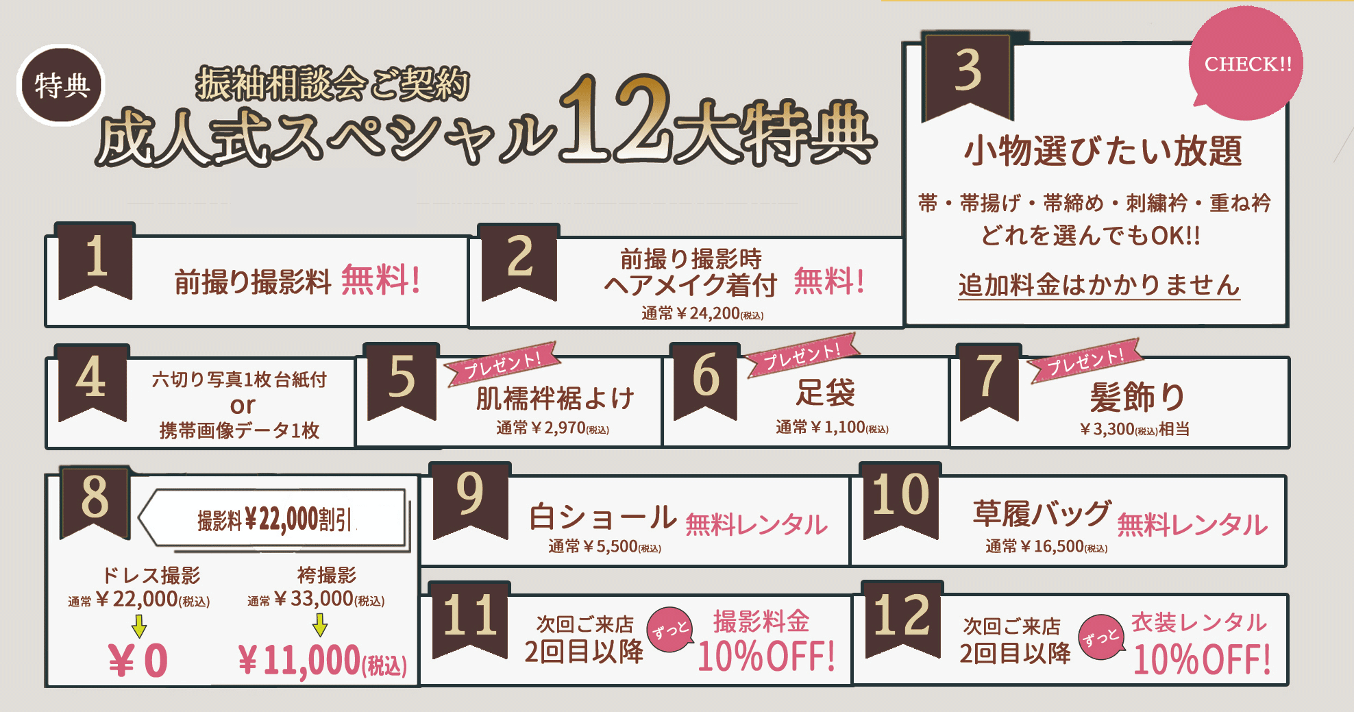 振袖レンタルご成約のお嬢様には必ず10万円相当の12大特典をプレゼント!!